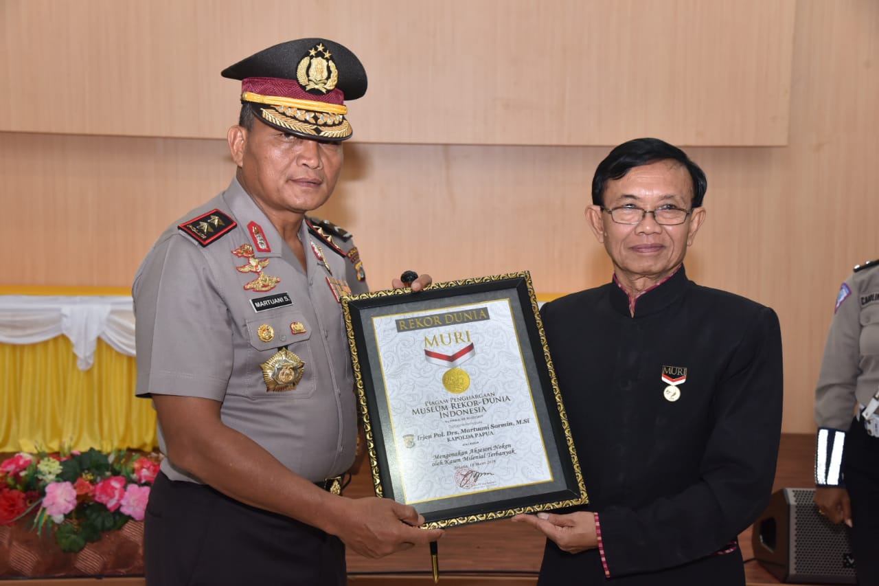 Penghargaan di berikan langsung oleh tim direktur MURI Yusuf Ngadri kepada Kapolda Papua Irjen Pol Drs.Martuani Sormin, M.Si, di aula Rasta Samar, Mapolda Papuua,Senin (18/3/2019)