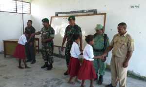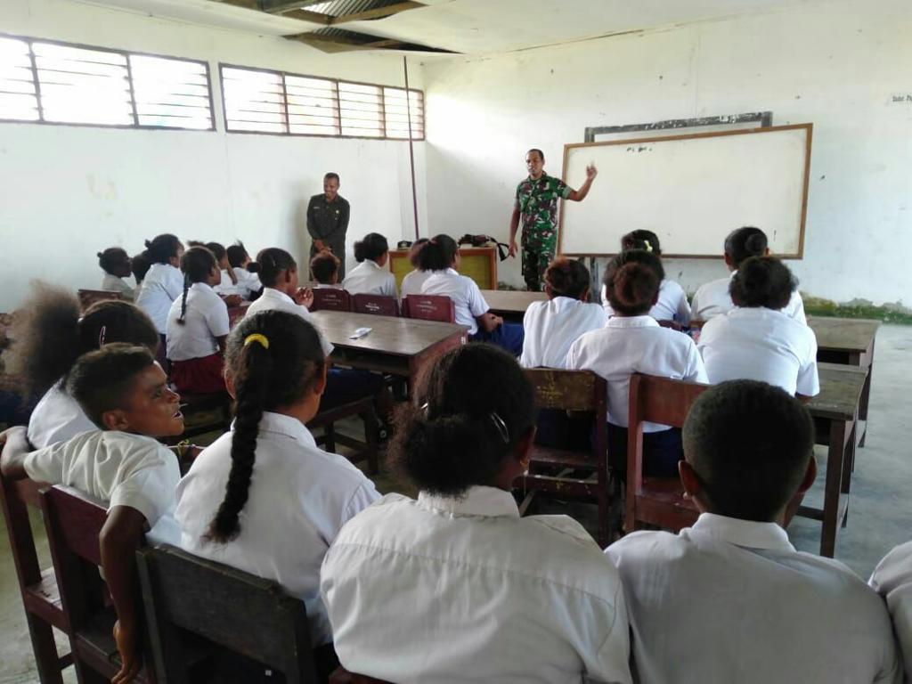 Yapen-(KT) Guna menumbuh kembangkan jiwa patriotik dan cinta tanah air kepada generasi muda bangsa, Babinsa Koramil 1709-04/Yapbar Serma Anaklektus Worumi dan Kopda Matris memberikan pembinaan dan pembekalan wawasan kebangsaan kepada Siswa-Siswi SMP Satu Atap dan SD Inpres Kampung Sasawa, Kab. Kep. Yapen, Rabu (10/04/2019).