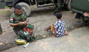 Keerom-(KT) Hendak menuju Pos Kotis Satgas Yonif 725/Woroagi, anggota Pos Kout yang dipimpin oleh Dokter Satgas Yonif 725/Woroagi Letnan Dua Ckm Muh. Wira Brimanniko berhenti ditengah perjalanan demi mengobati pejalan kaki yang tengah terluka di Kampung Kalimao, Distrik Waris, Kab. Keerom. Jum’at, (12/04/2019).