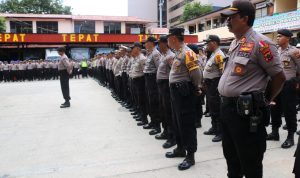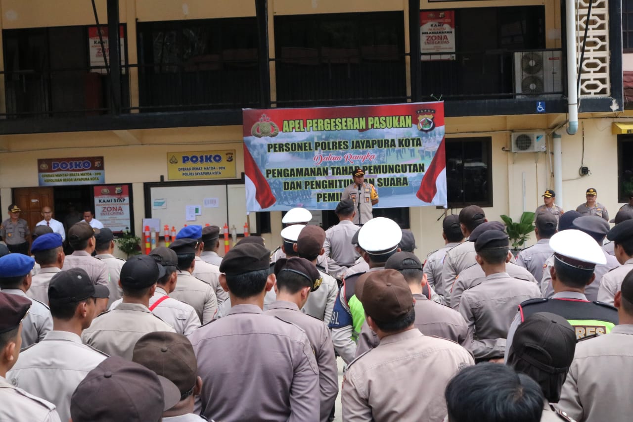Jayapura Kota-(KT) Sebanyak 518 personil Polres Jayapura Kota dan BKO Polda Papua mengikuti Apel Pergeseran Pasukan dalam rangka pengamanan tahap pemungutan dan penghitungan suara pemilu 2019 di Halaman Mapolres Jayapura Kota. Senin (15/4) pagi.