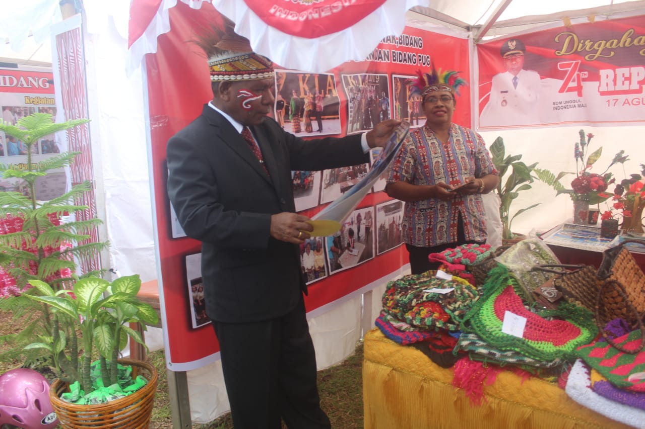 Bupati Jayapura saat melihat pameran OPD dari dinas pemberdayaan perempuan dan perlindungan anak dalam memeriahkan HUT RI Ke-74 di Halaman Kantor Bupati Jayapura( Humas Diskominfo Pemkab Jayapura)