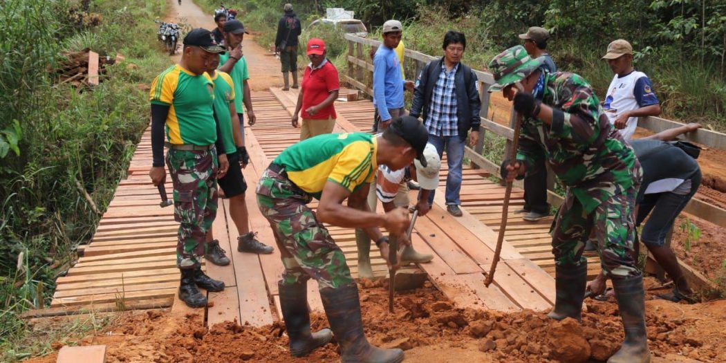 MERAUKE (KT) — Personel Pos Komando Taktis (Kotis) Satgas Pamtas RI-PNG Yonif MR 411/PDW Kostrad membantu warga memperbaiki jembatan penghubung dua kampung yang telah lama rusak di kampung Bumun, Bupul 9, Distrik Elikobel, Kabupaten Merauke, Sabtu(24/8/2019).