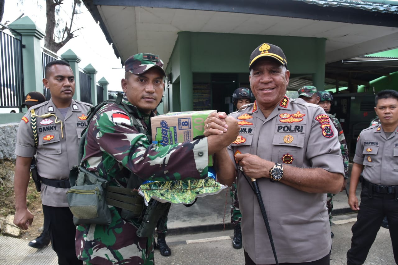 Kunjungan Kapolda Papua bersama rombongan di perbatasan untuk melakukan pengecakan personil TNI- Polri yang sedang melaksanakan tugas di pebatasan Skouw, dalam kunjungannya Kapolda Papua juga memberikan sembako kepada personil di Makotis Satgas 713 Gorontalo dan Pospol Perbatasan Skouw.
