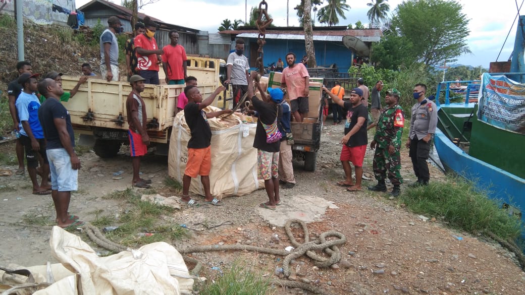 Terkait itu, TNI-Polri yang juga masuk dalam satuan gugus tugas Covid-19 Kabupaten setempat turut membantu, dengan melakukan bongkar muatan KM Lestari Permai dan kapal kayu yang mengangkut bahan makanan dan sembako serta alat kesehatan yang dikirim dari Jayapura minggu lalu, masyarakat setempat pun ikut bergotong royong membantu.
