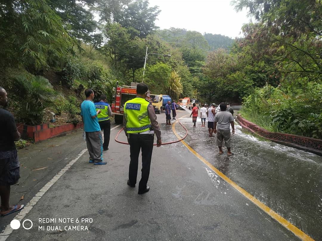 “Mendapat informasi adanya solar yang tumpah sehingga wakapolsek bersama personil langsung menuju TKP serta menghubungi pemadam kebakaran dan mengalihkan arus lalu lintas untuk mengantisipasi adanya korban jiwa akibat solar yang tumpah, apalagi itu daerah tanjakan dan turunan, ” Ujarnya.