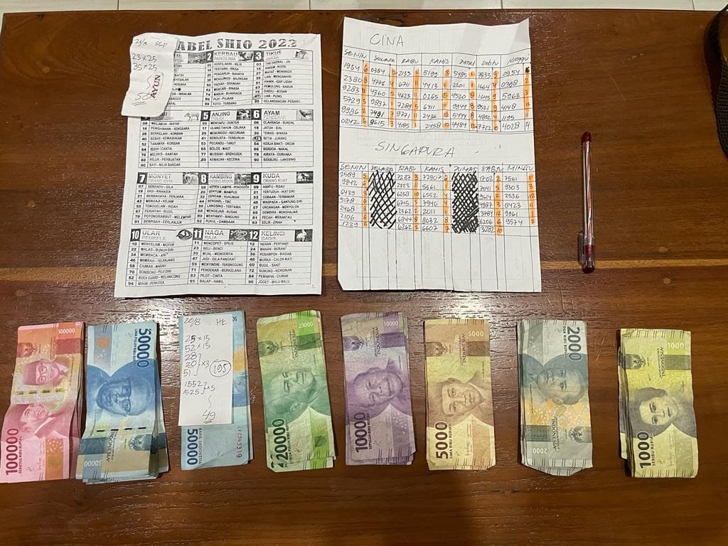 “Selain uang tunai sejumlah sekian dalam berbagai pecahan uang kertas, kami juga mengamankan barang bukti berupa Tabel Shio satu lembar, Tabel Angka Keluar satu lembar, Bolpen Faster satu buah dan Kupon hasil pembelian dua lembar,” ungkapnya.