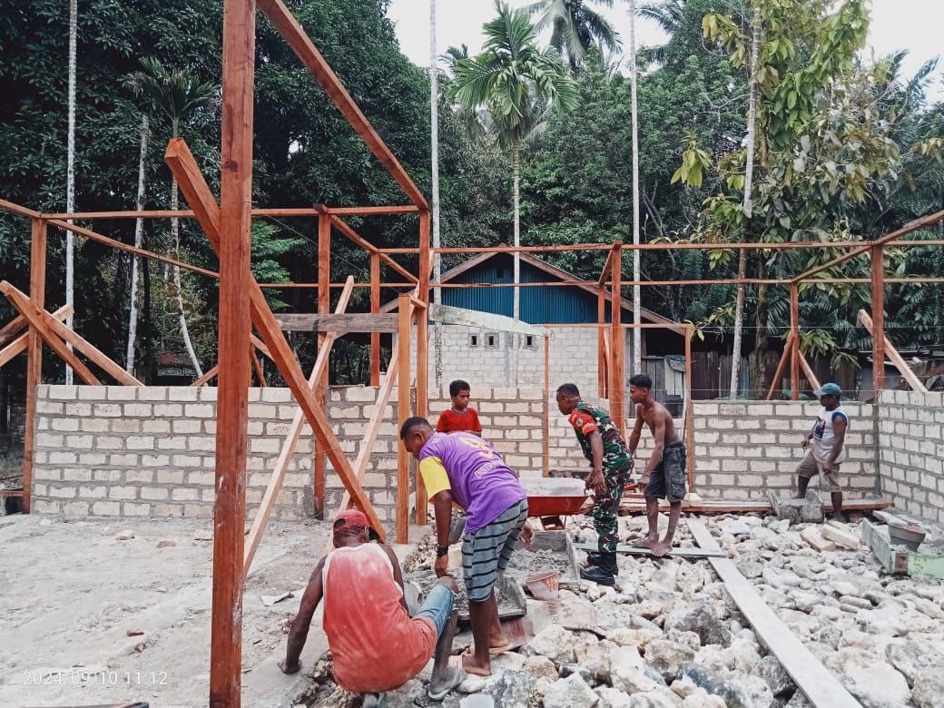 Warsa, (KT)- Sebagai wujud kepedulian TNI dalam meringankan dan mengatasi kesulitan masyarakat di sekelilingnya, personel Posramil 1708-02/Biak Utara-Warsa membantu pemasangan batu tela untuk pembangunan rumah warga binaannya di Kampung Imbari, Distrik Warsa, Kabupaten Biak Numfor, Jumat (13/9/2024).
