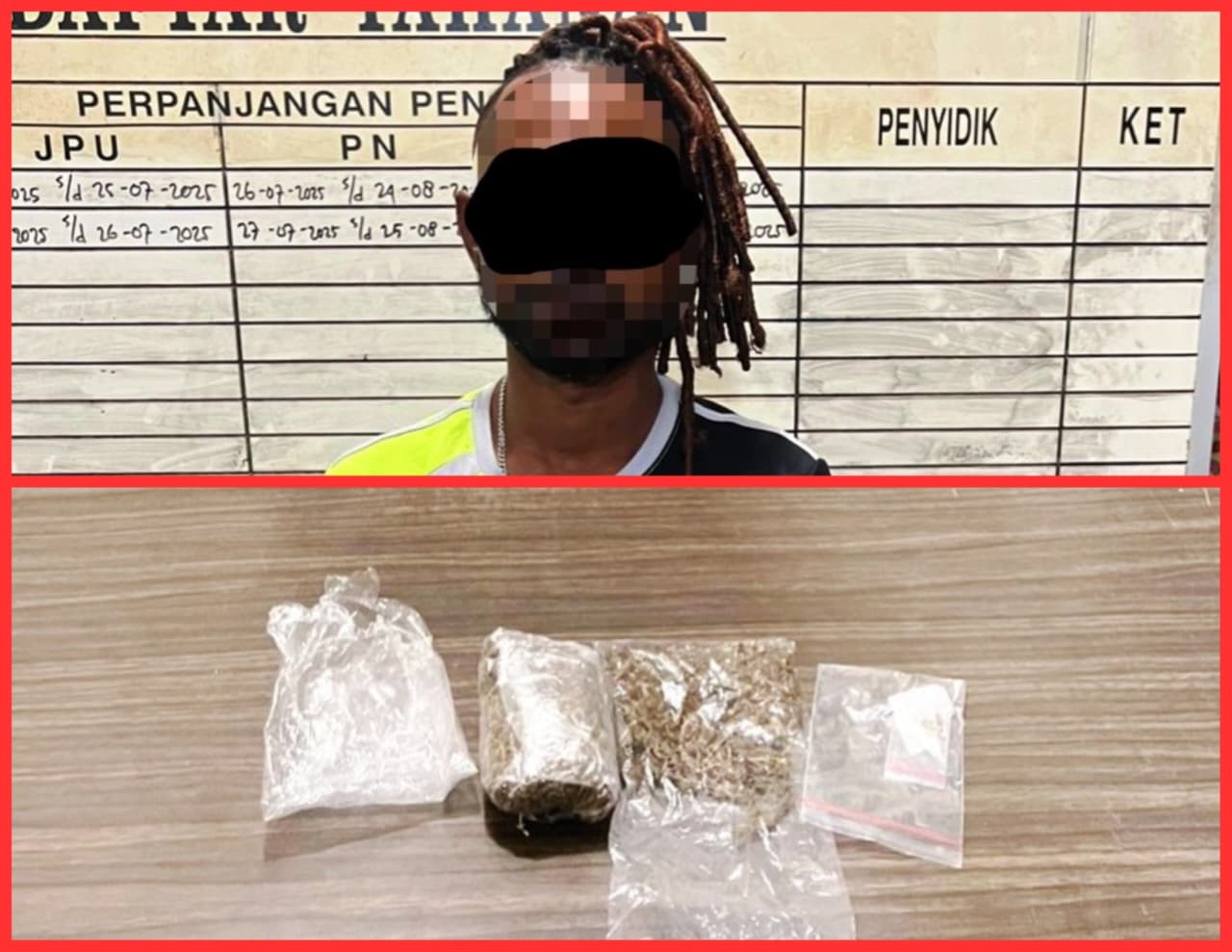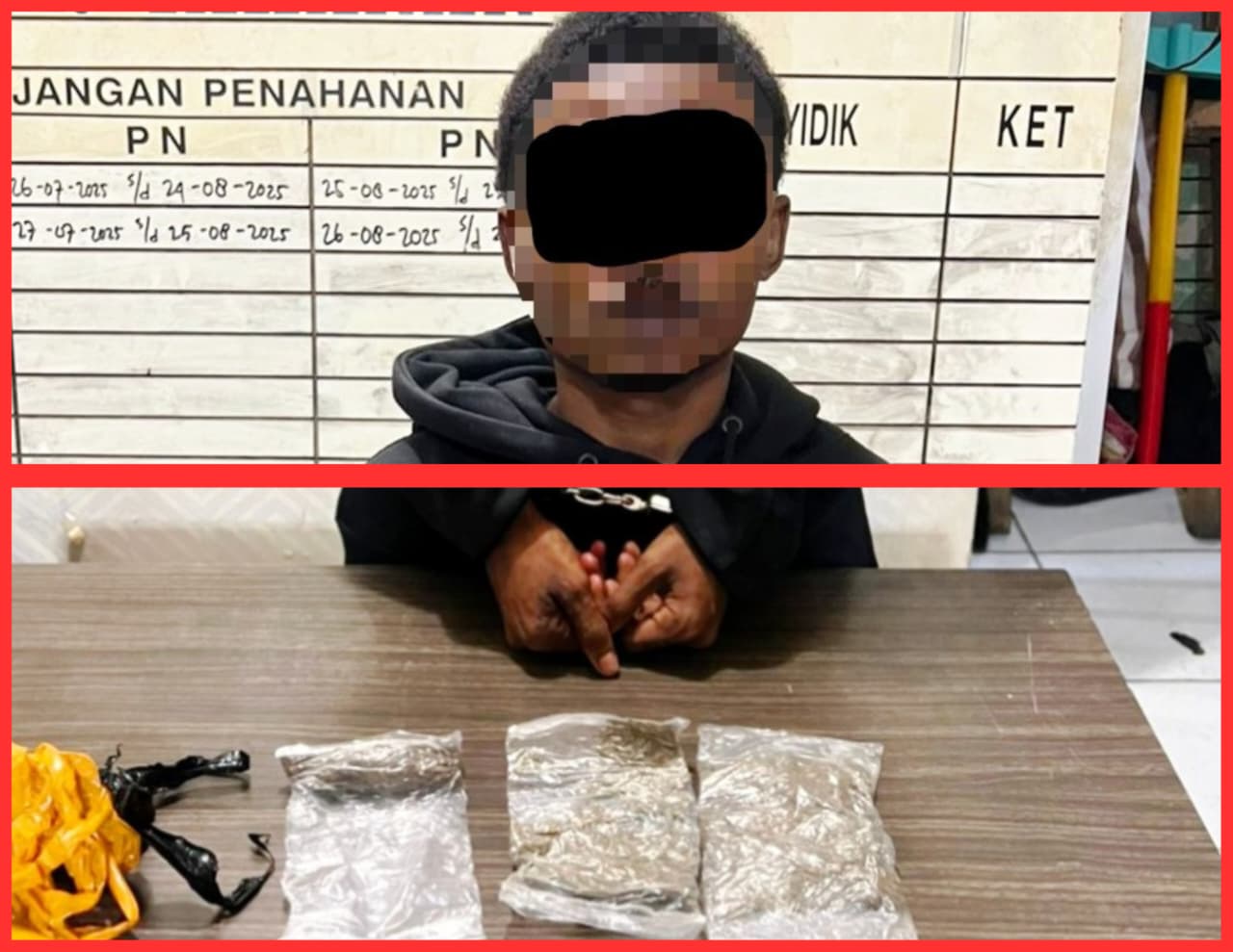 2. Tersangka BYM (35): Warga Dok VII Jayapura ini diamankan satu jam kemudian (21.00 WIT). Ia mencoba menyembunyikan 64,22 gram ganja di dalam bungkus teh kotak dan tempat sabun. Petugas juga menemukan satu paket kecil berisi biji ganja dalam tasnya.